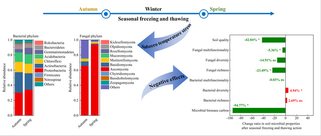 王振华教授作为通讯作者、博士研究生宗睿为论文第一作者,在《Science of the Total Environment》(SCI,中科院一区Top,IF=10.753)发表了题为“Assessing the impact of seasonal freezing and thawing on the soil microbial quality in arid northwest China (我国西北地区季节性冻融对土壤微生物质量的影响评估)”的研究成果,从微生物角度揭示了新疆北疆地区季节性冻融对土壤质量的不利影响,研究表明,与冻结前相较,季节性冻融循环显著影响土壤微生物群落组成及其丰度,并显著减少土壤微生物量和多样性,从而在一定程度上削弱土壤生态功能。
