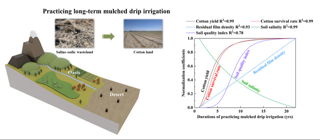 随着新疆膜下滴灌技术规模化推广应用,在新疆干旱少雨、绿洲灌溉农业特殊背景下的长期膜下滴灌生态演变问题备受各界关注,yl23455永利王振华教授团队围绕相关问题持续开展了大量研究,近期三项最新研究成果连续在国际环境科学领域顶级期刊发表。