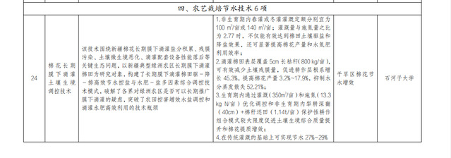 近日,水利部全国节约用水办公室公示了《国家成熟适用节水技术推广目录(2023年)》(下称《目录》),全国入选34项,其中农田节水灌溉技术9项,灌区水管理技术5项,智慧灌溉技术9项,农艺栽培节水技术6项,畜牧渔业节水技术1项,农村生活节水技术4项。经单位推荐、专家评审等环节,公司王振华教授团队成果“棉花长期膜下滴灌土壤生境调控技术”成功入选《目录》。据悉,2019—2023年水利部共公布4批(除2022年)《目录》,合计194项成果,这是新疆单位成果首次入选该《目录》。