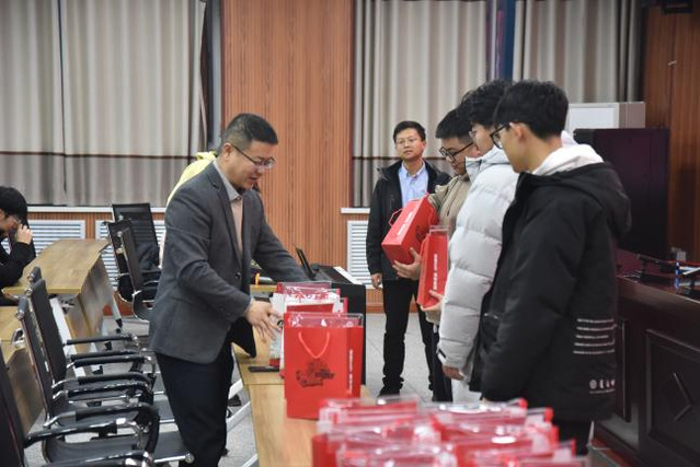 娄哲代表公司党委向同学们表达慰问,为考研学子们加油打气,鼓励同学们在考研的最后冲刺阶段要调整好心态,以饱满的精神状态迎接考试。随后,娄哲为考研学子们发放了考研温馨大礼包,情意满满的大礼包“内容”非常丰富,有柿子、橙子和订制版可口可乐,寓意“事事如意、心想事成、成功上岸”;有考试专用工具、口罩,为考试顺利保驾护航;还有辅导员、班主任手写祝福卡片,让同学们被爱包容充满力量。