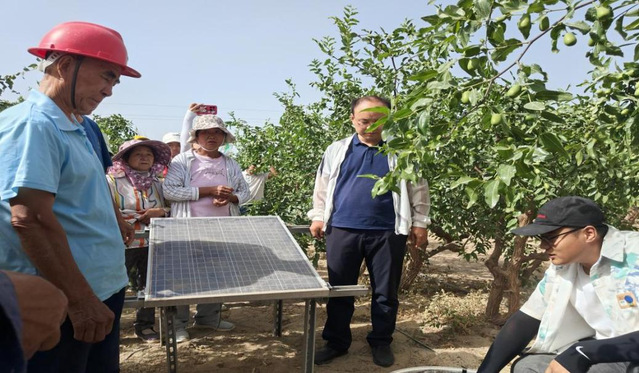 依托新疆昆玉皮墨垦区红枣科技小院,在培训过程中,李海强副教授等向当地职工讲解了土壤水盐运移规律并培训了电动电磁阀、虫情监测仪、苗情监测仪、水温盐水势仪、灌溉指导器及地下水位监测仪等设备的使用方法。此外,根据当地“盐频肥瘠”的情况,该科技特派员团队为提高职工枣园水肥利用效率和改善枣树坐果率,向重点帮扶职工免费提供新型高效肥和农药。