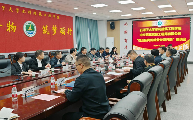 10月12日,中交第三航务工程局有限公司人力资源部总经理尤华慧一行来到公司开展座谈交流。公司党委书记汤骅,党委副书记娄哲,党委委员、副经理袁康,员工会秘书长、就业联络员谢嵘,各有关专业系、办公室负责人及毕业年级辅导员参加座谈。会议由娄哲主持。
