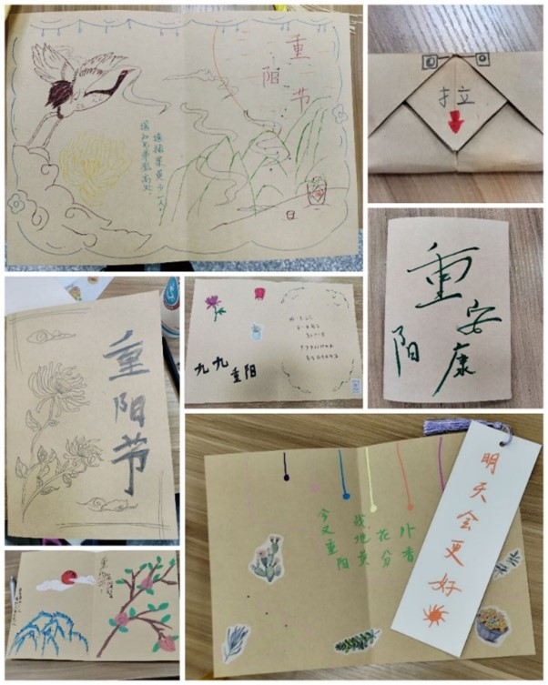 绘制完毕后,主持人邀请同学们积极分享自己的设计构思,其中马琴琴同学构思巧妙:“我在贺卡上画了山峰与飞鸟,老人如山峰,我们如飞鸟,我们可以飞越重峦去往更大的世界,但山峰永远会在那里守着,为我们提供一个归宿,我们应该孝顺老人。”其他同学也积极分享,现场工作人员为发言者与绘制优秀者分发了奖品;最后大家举着自己制作的贺卡合影留念,将此刻的欢乐定格。