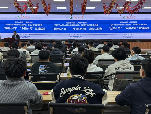 会上,与会师生共同观看了2025年兵团“世界水日、中国水周”宣传视频。兵团水利局水资源处督查专员、正高级工程师许钦做宣讲,主要介绍了现阶段新疆水资源概况、新疆及兵团水资源开发利用情况及兵团在水资源管理方面开展的工作。