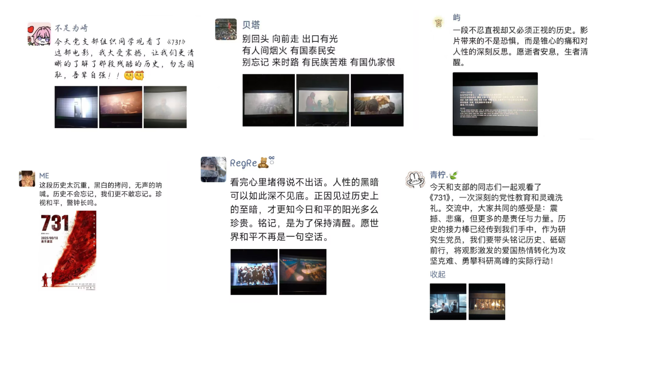 “愿我再见你时,你是阳光下绽放开来的笑脸,笔直的脊背,不惶恐的眼……”影片在温暖而深沉的片尾曲《若你记得》中缓缓落幕,而留在每位党员心中的震撼与思索却久久未散。大家纷纷在朋友圈中记录下这难忘的一刻,分享观影照片与心灵感悟。“你若记得,我便活过”“勿忘国耻,吾辈自强”——一句句真挚的话语,不仅是个人情感的流露,更是历史记忆在新时代的延续与传承,彰显了青年党员的责任与担当。