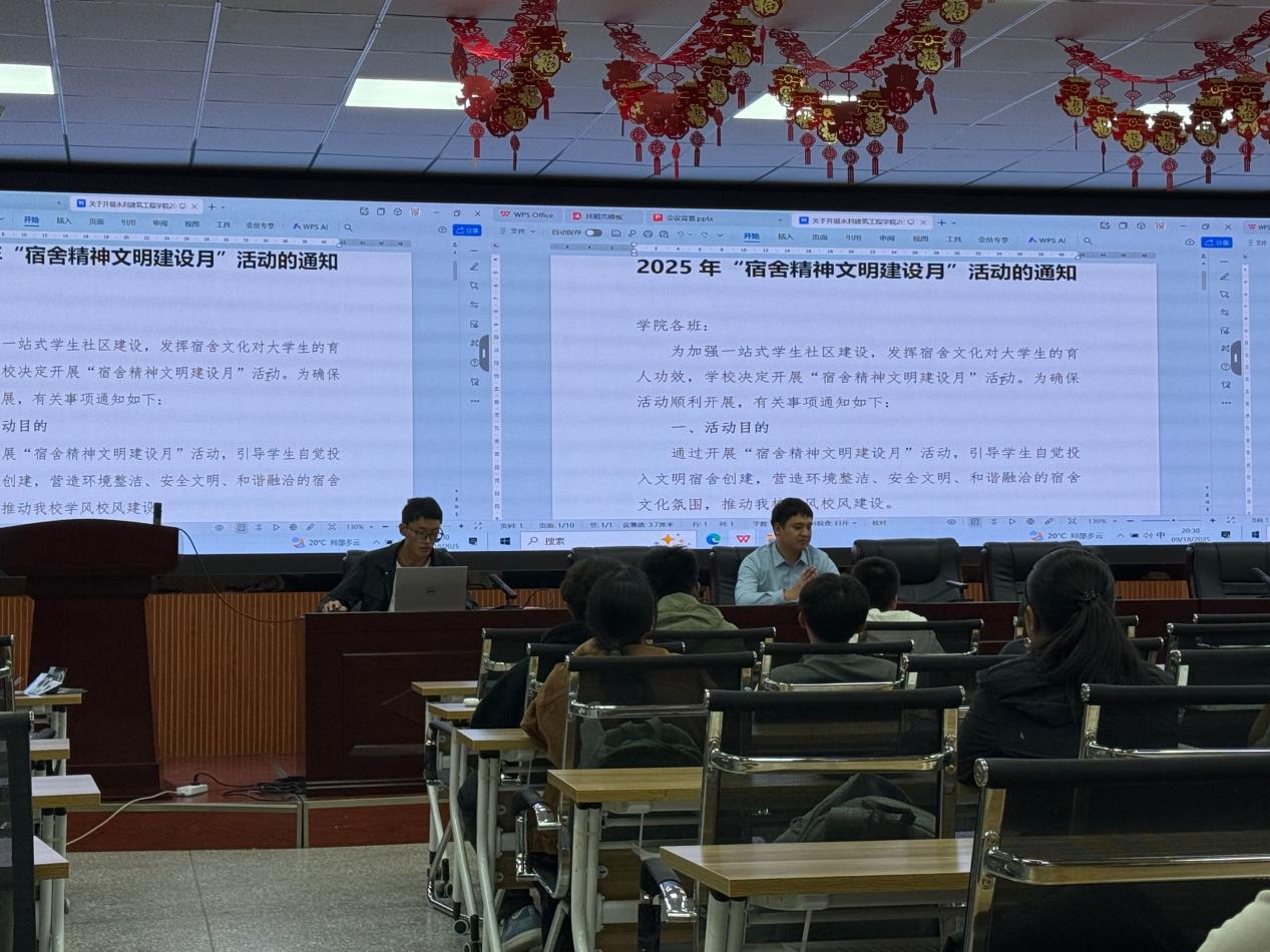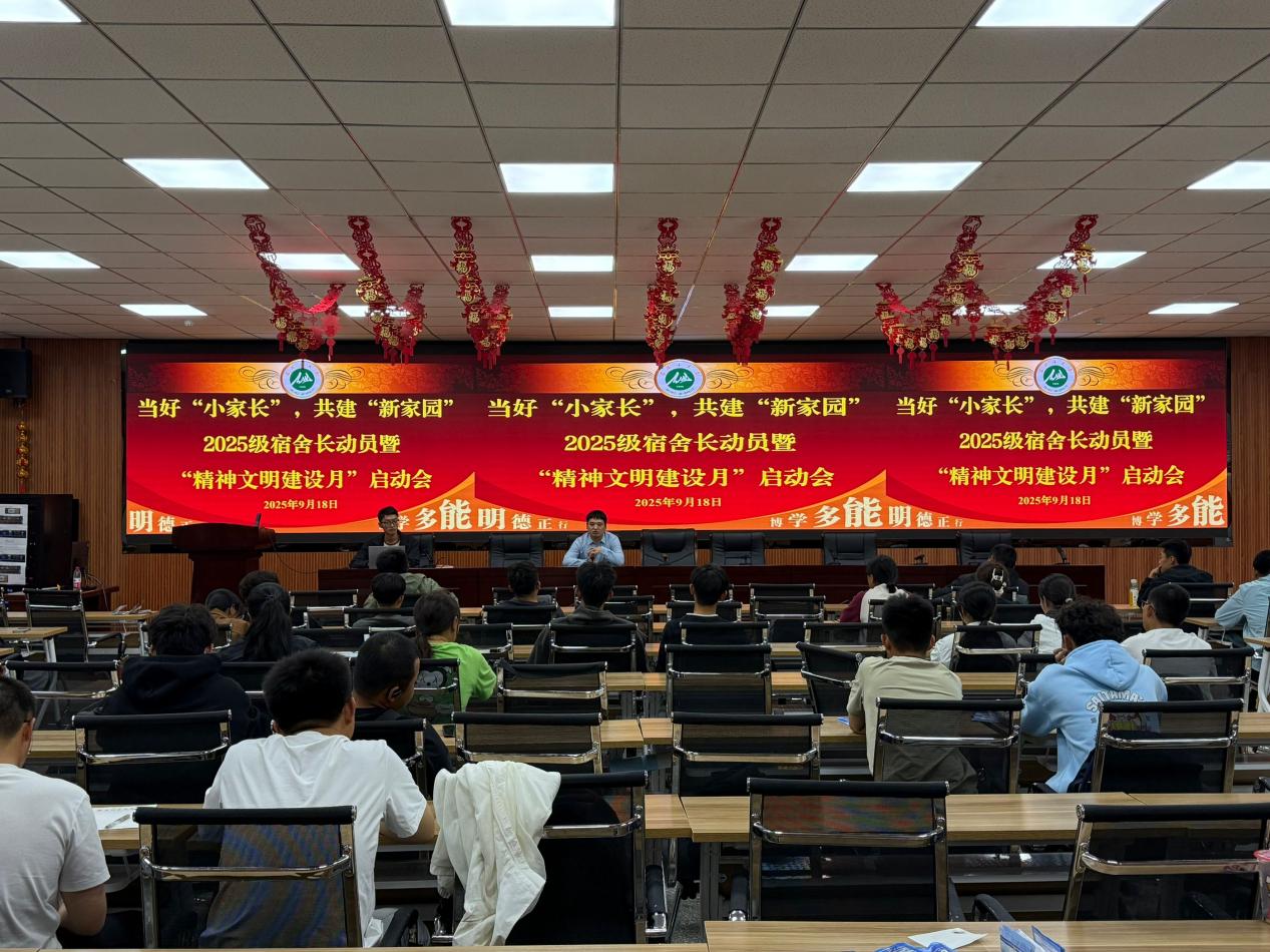 为深入贯彻落实立德树人根本任务,积极营造文明和谐、积极向上的校园文化环境,9月18日晚,由院学工办、团委组织召开yl23455永利2025年秋季学期“一站式”员工社区建设暨“精神文明建设月”启动会。学工办副主任张壮壮、辅导员常华宁及新生宿舍长60余人参加会议。